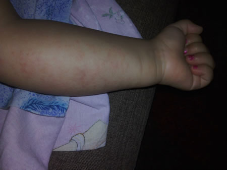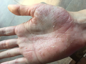 Debutul afectiunii poate fi adesea la nivelul extremitatilor (degete), periorbitar sau in jurul gurii, in axile si la nivelul organelor genitale.